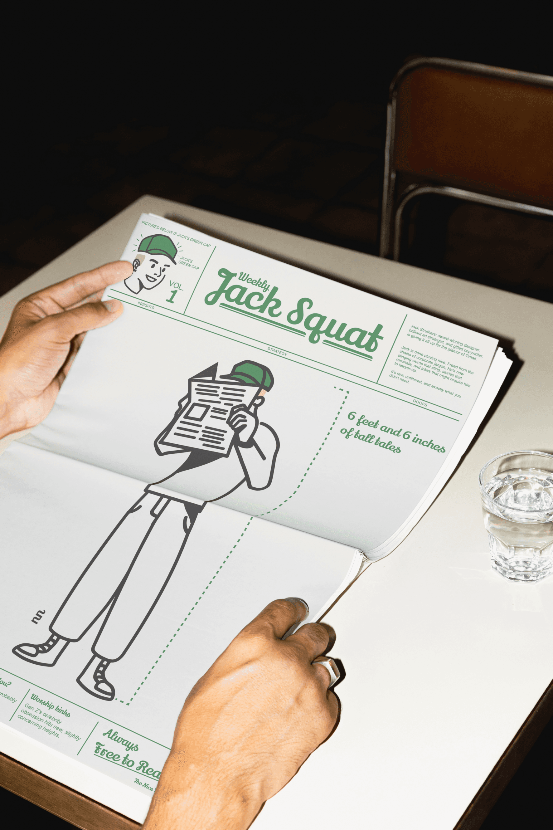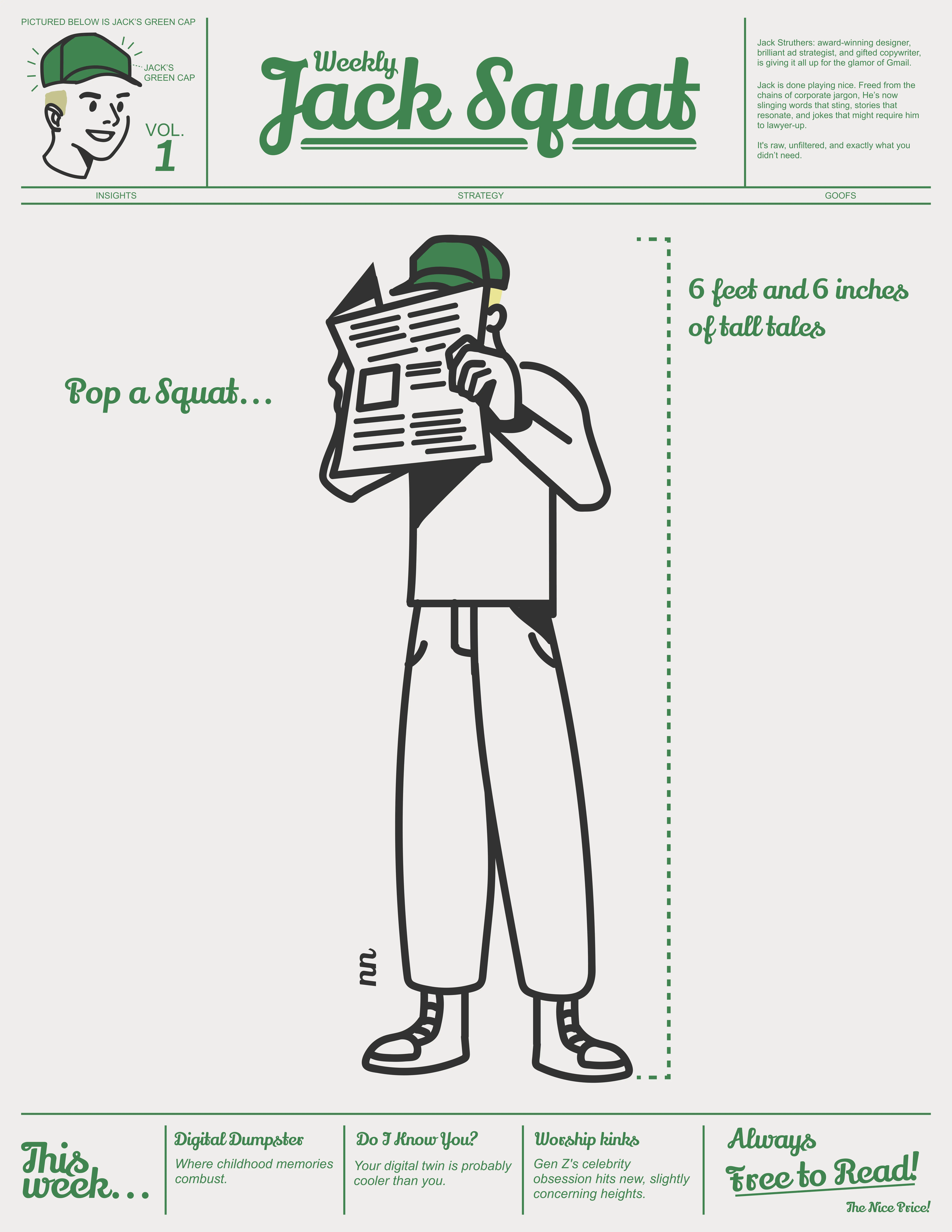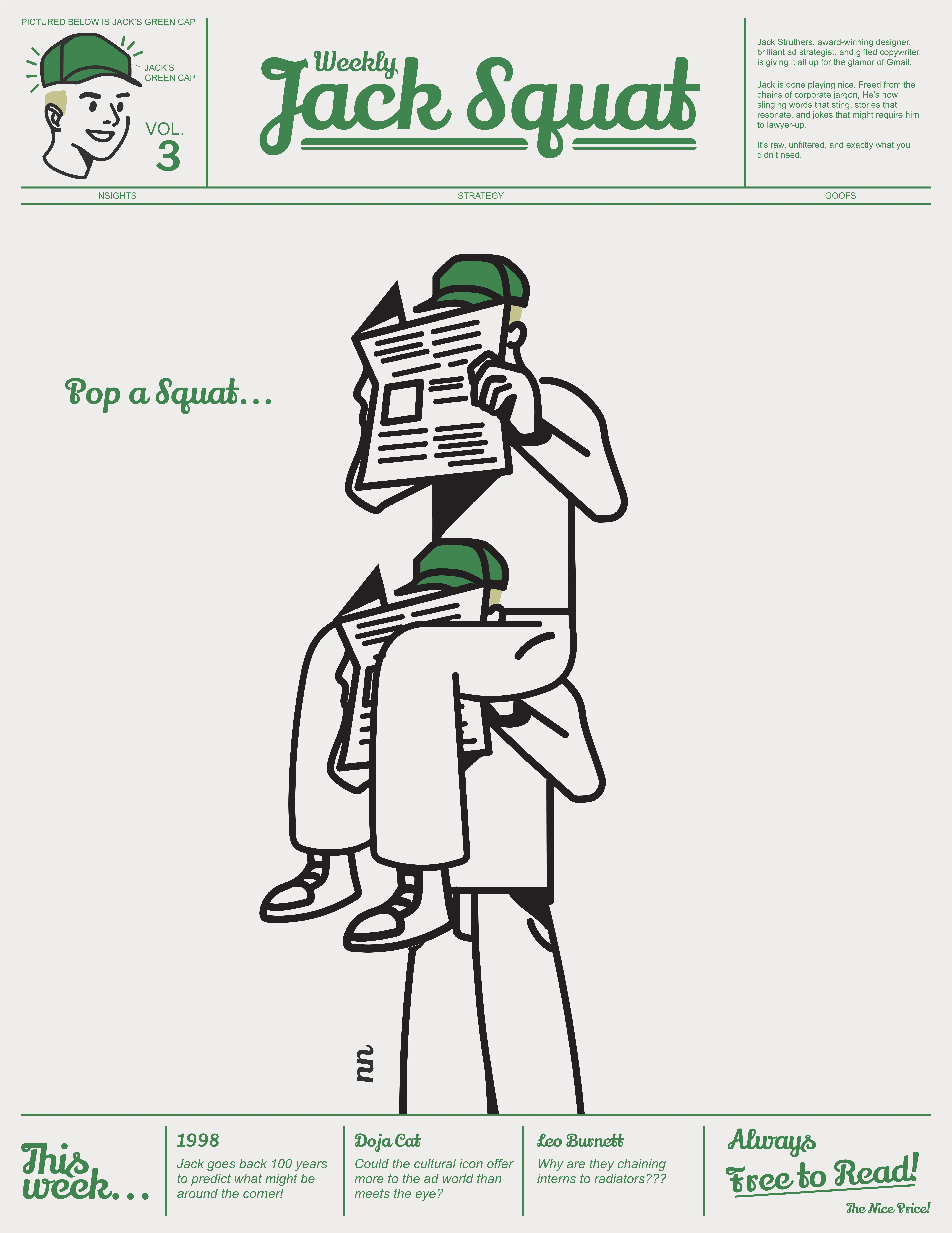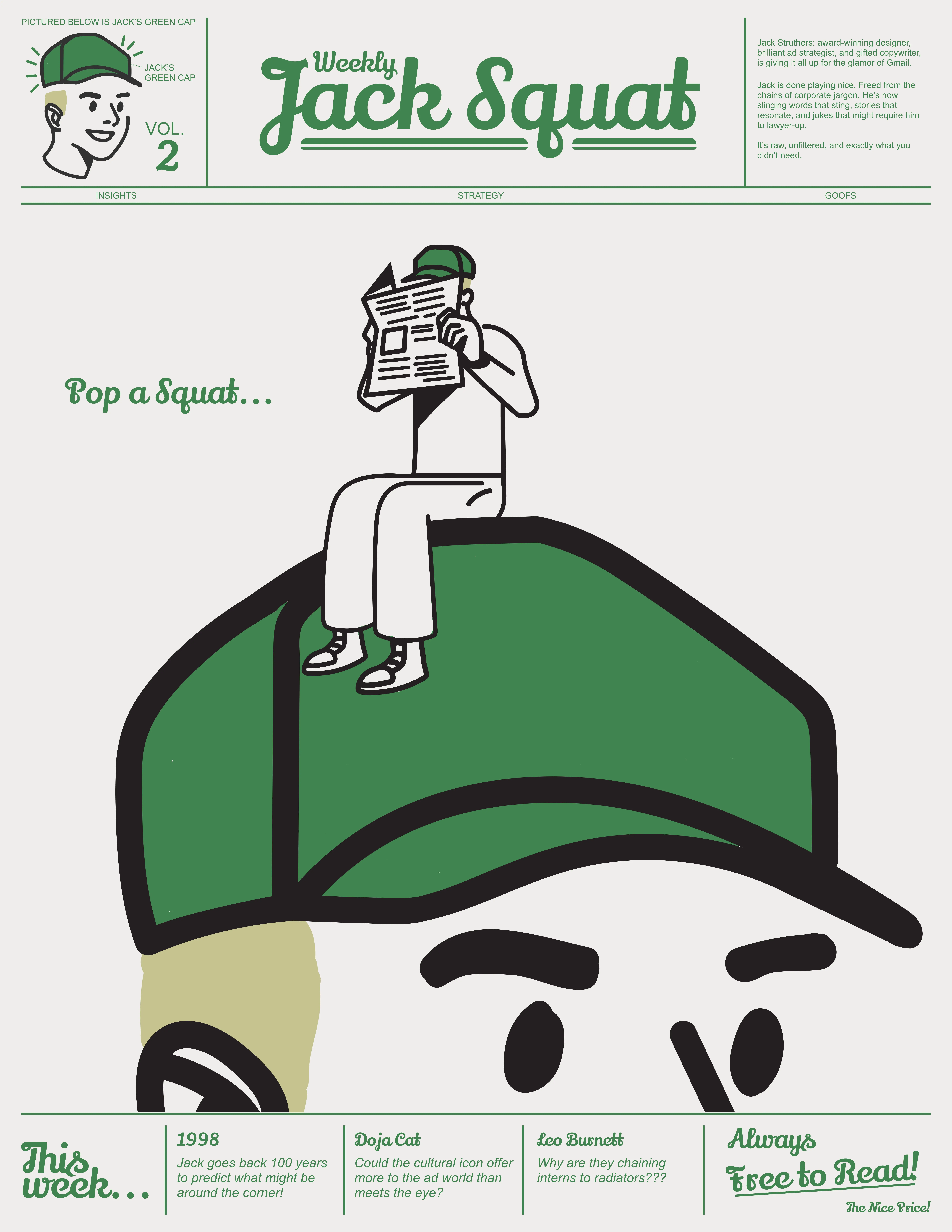 Jack Struthers: designer and strategist turned newsletter columnist, is uncovering the mysteries of the modern world in his weekly newsletter column. Join Jack between the bi-folds to see what lies between his green thinking cap, and turn to the cover to see where I make Jack squat next…